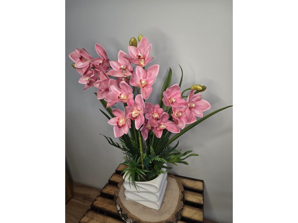 Luxusní dekorace Růžová Orchidej cymbidium v disegnovém bílém keramickém květináči.